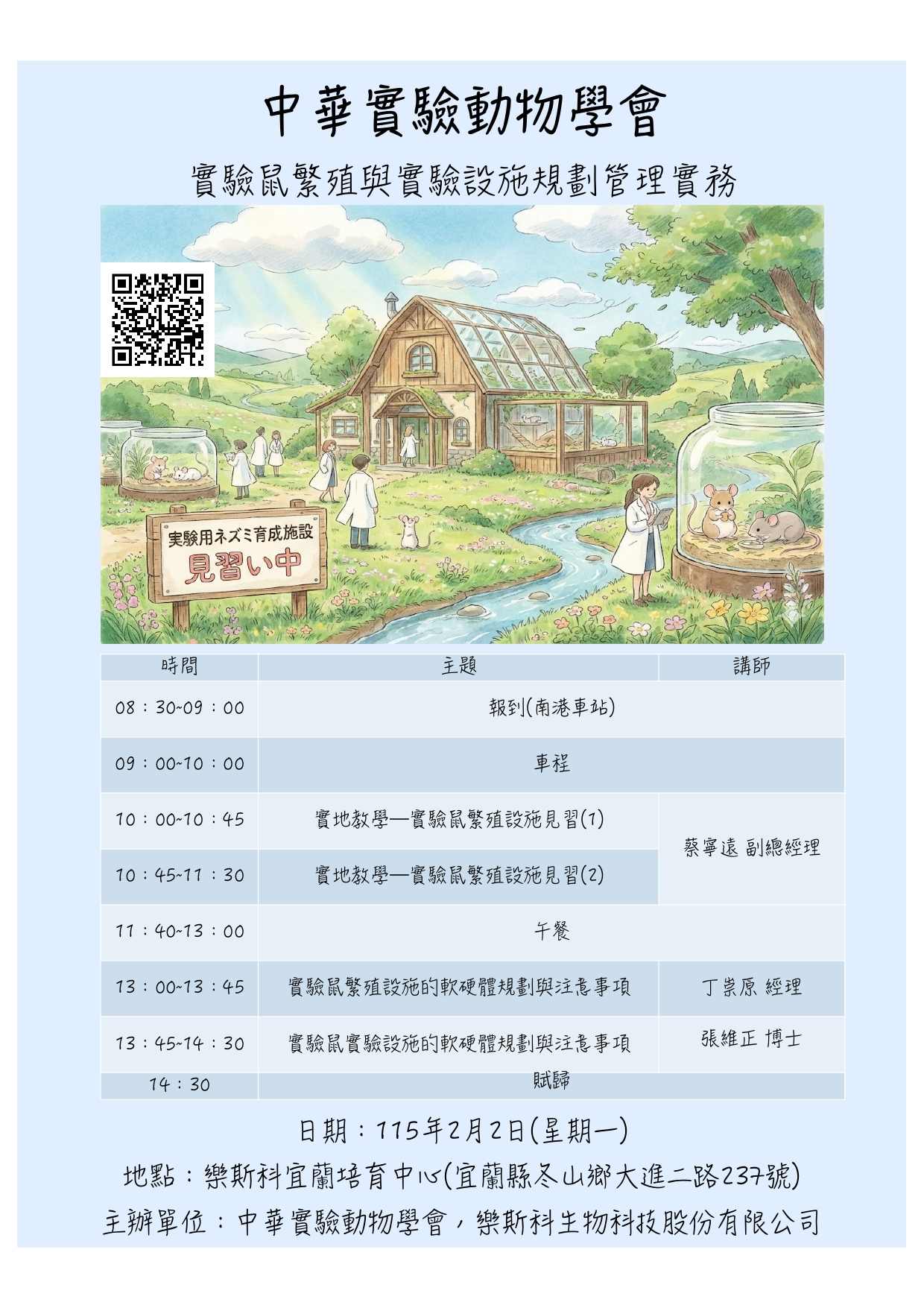 【轉知】中華實驗動物學會-實驗鼠繁殖與實驗設施規劃管理實務